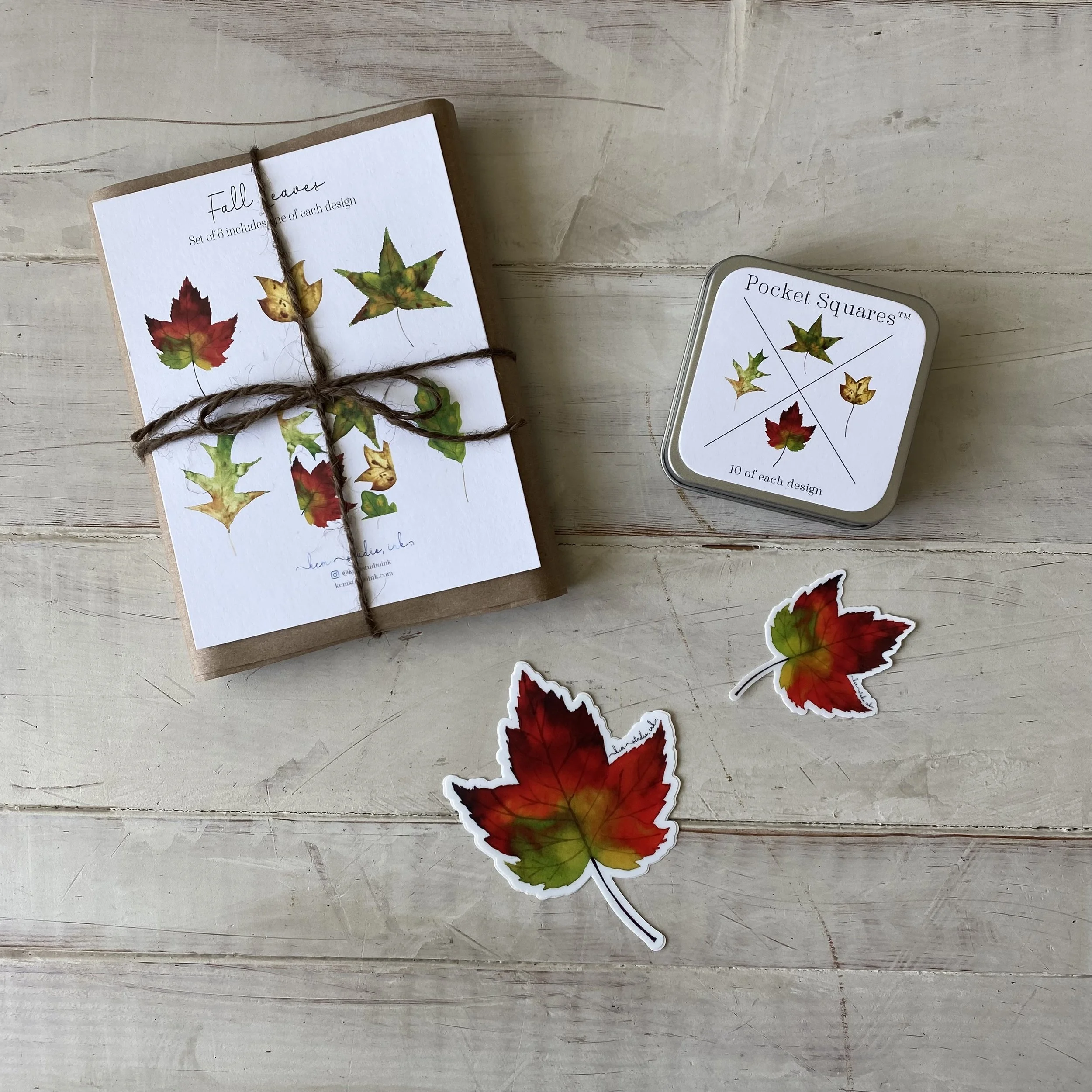 Fall Leaves Gift Card Set + Fall Leaves Pocket Square™ Note Tins & 2 Red Leaf Maple stickers for $40!